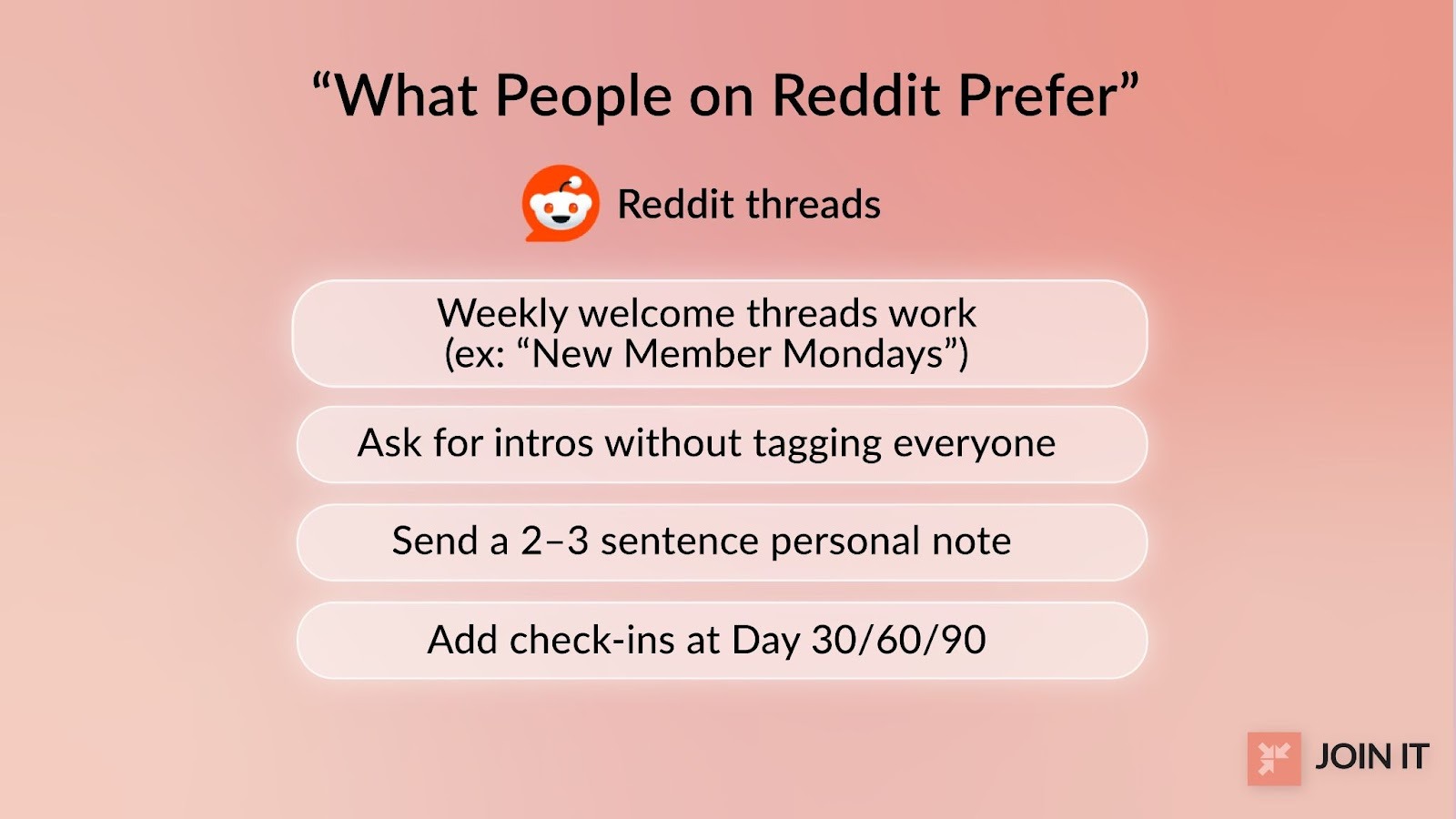 Personal touch wins: Redditors consistently mentioned that the best welcomes they received were short, warm, personal messages from group leaders, not long boilerplate letters.