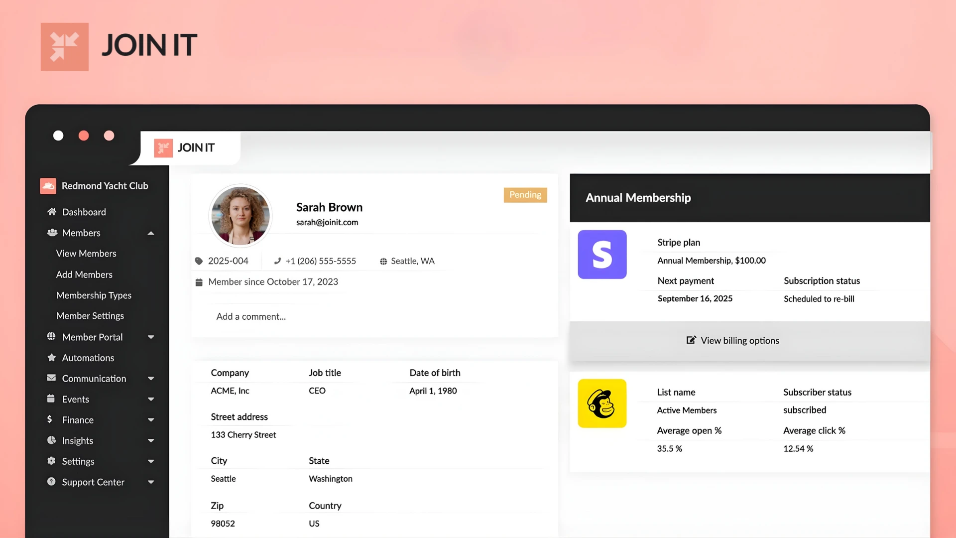 Join It's membership software management tools integrate directly with Stripe and other payment processors. That means no more chasing invoices or manually reconciling transactions.