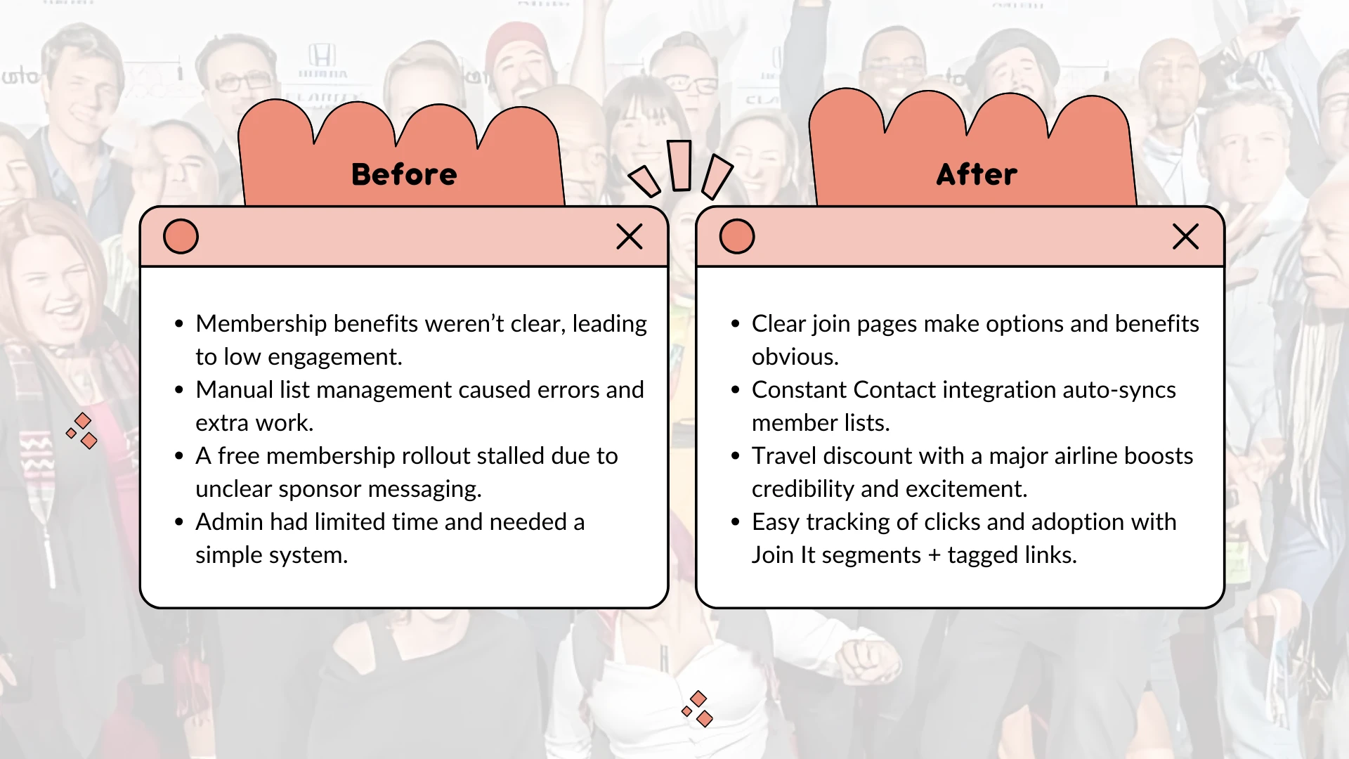 - Email lists that stay in sync. Join It’s Constant Contact integration keeps membership data aligned with mailing lists automatically, cutting manual work and errors.